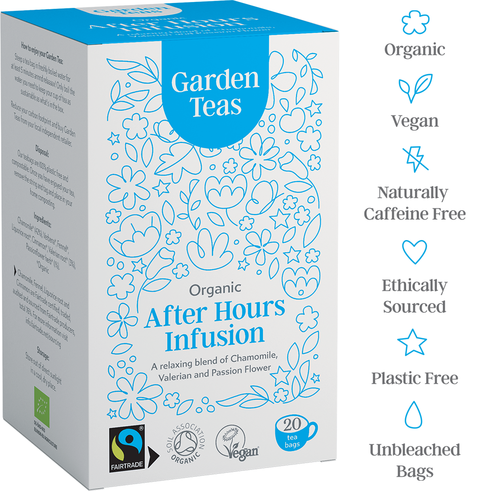 Calm your mind, body and soul with a cup of our organic, ethically sourced After Hours Infusion. This aromatic blend of Chamomile, Valerian and Passionflower creates the perfect cup to gently round off your day.