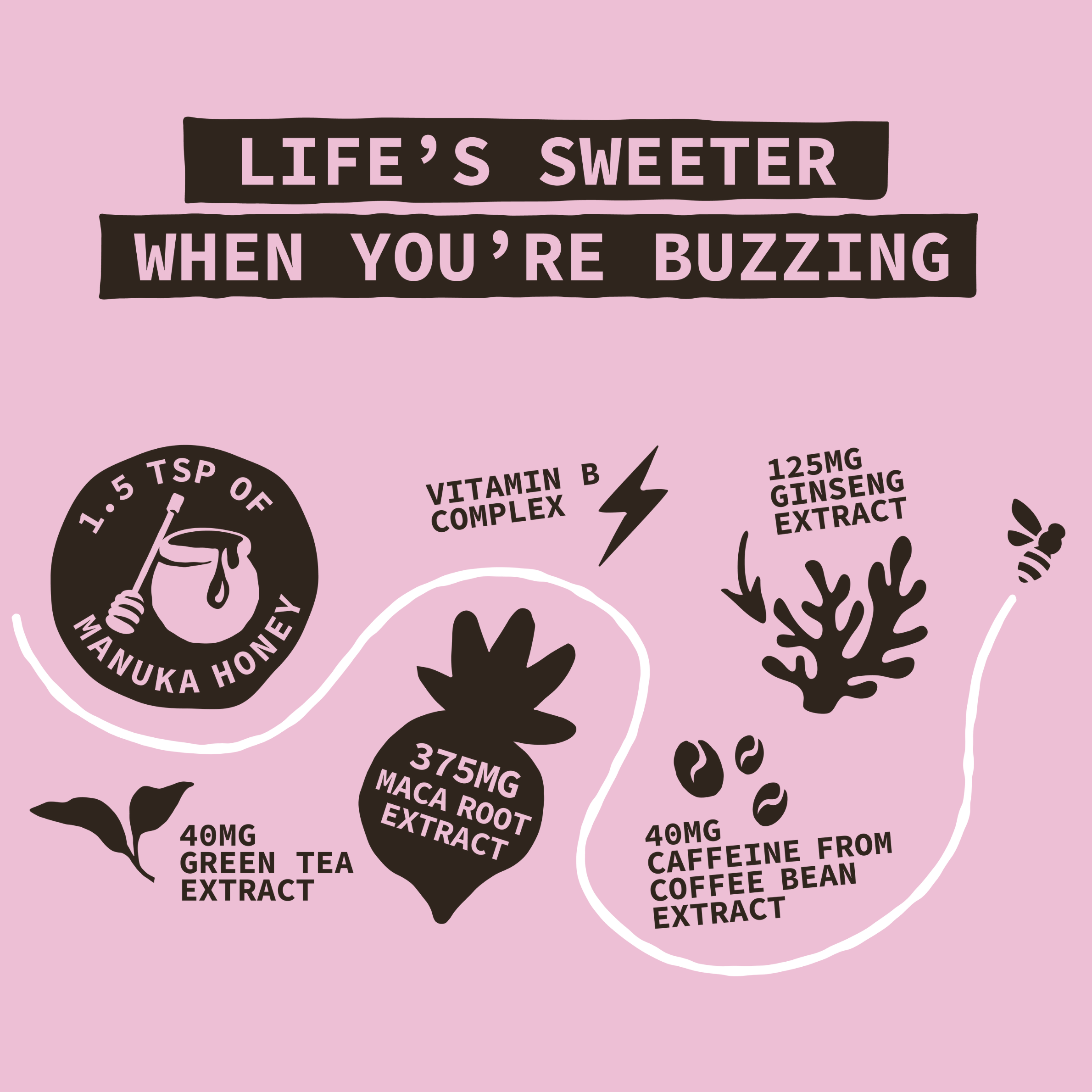 Sparkling cherry and lime flavoured drink with Manuka honey, Maca Root, Ginseng, Green tea (L-theanine), Caffeine from coffee bean and added vitamins. (Low Calorie) (Only Natural sugars)