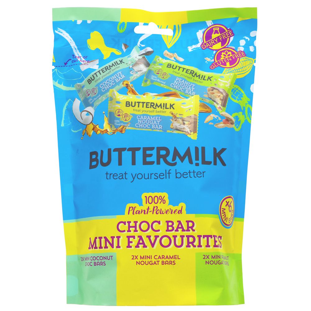 New Buttermilk Mini Choc Bar Favourites – a mini sized version of your favourite bars. The perfect selection box for flexitarians, vegans or excluders!
